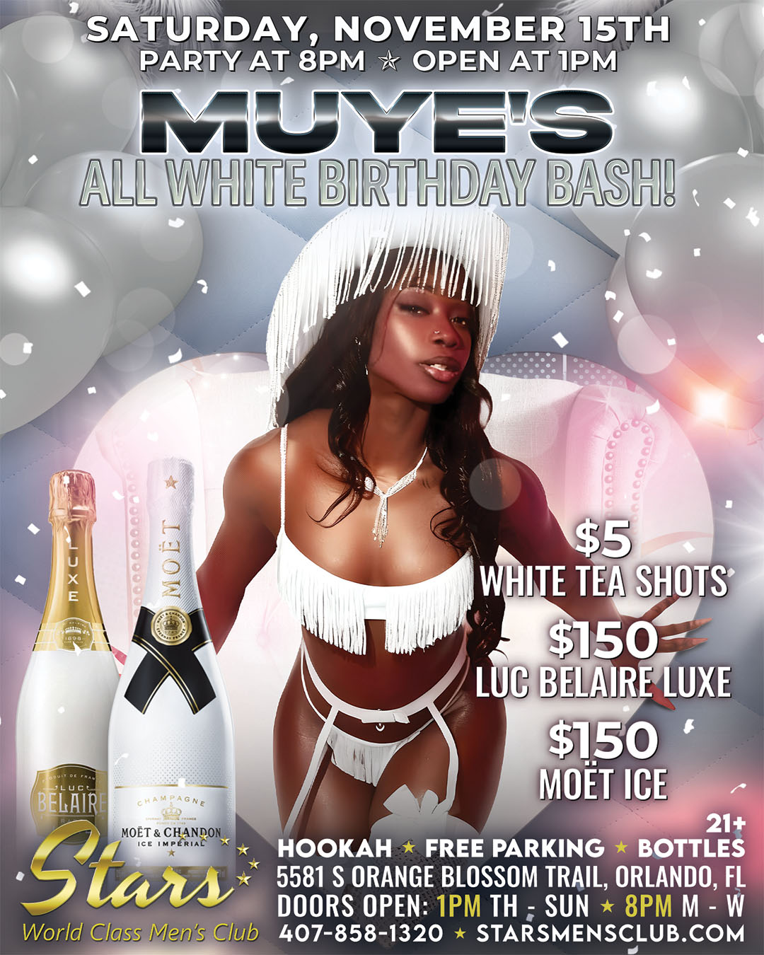 Join us Saturday, November 15th for Muye’s stunning All White Birthday Bash — an elegant night filled with luxury vibes, smooth drinks, and unforgettable energy. Dress in white and come ready to celebrate in true Stars style.